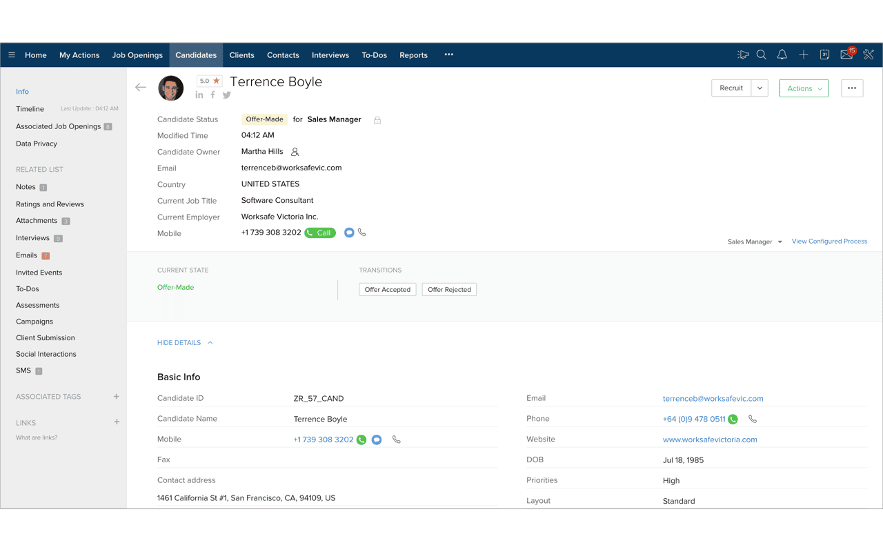 Say goodbye to Boolean search. With Zia Search, just type what you want in simple language, and Zia will search across all modules to brings you the exact record you're looking for. For example, find a strong match by searching for "a candidate with 5 years experience as a software engineer in the USA."