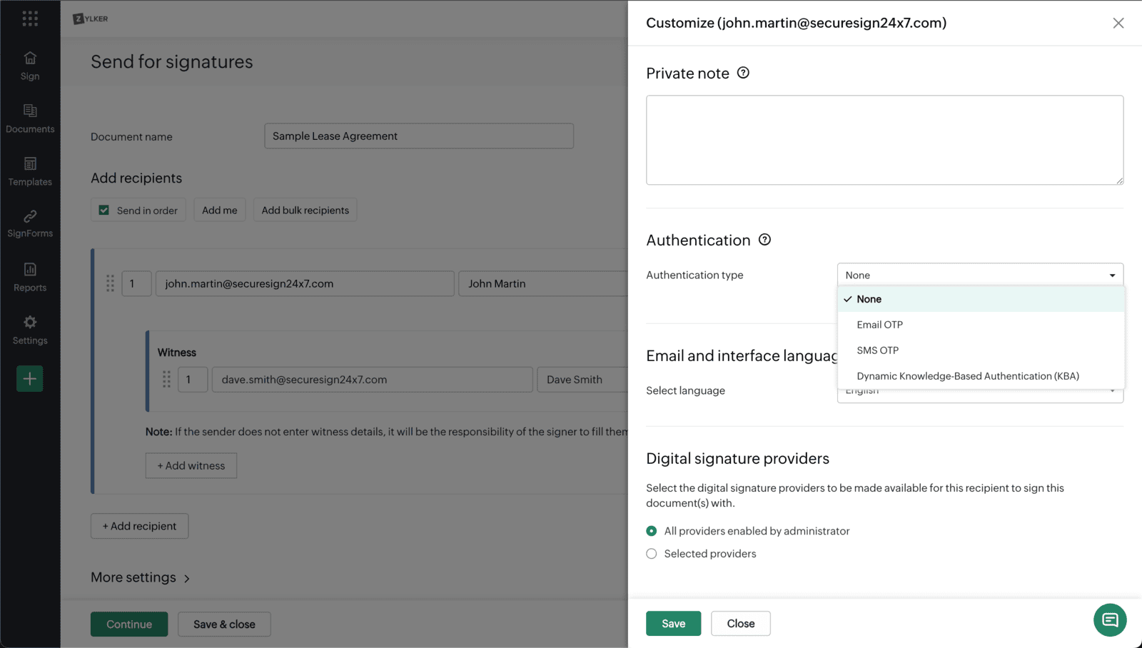 Zoho Sign lets conveyancers authenticate their signers in one of four authentication methods—email OTP, SMS OTP, EU eID methods, or offline OTP—which can be selected when sending documents to recipients, depending on the level of confidentiality.